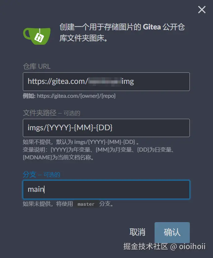 | Repository URL | https://gitea.com/<你的用户名>/img | 不带 .git |