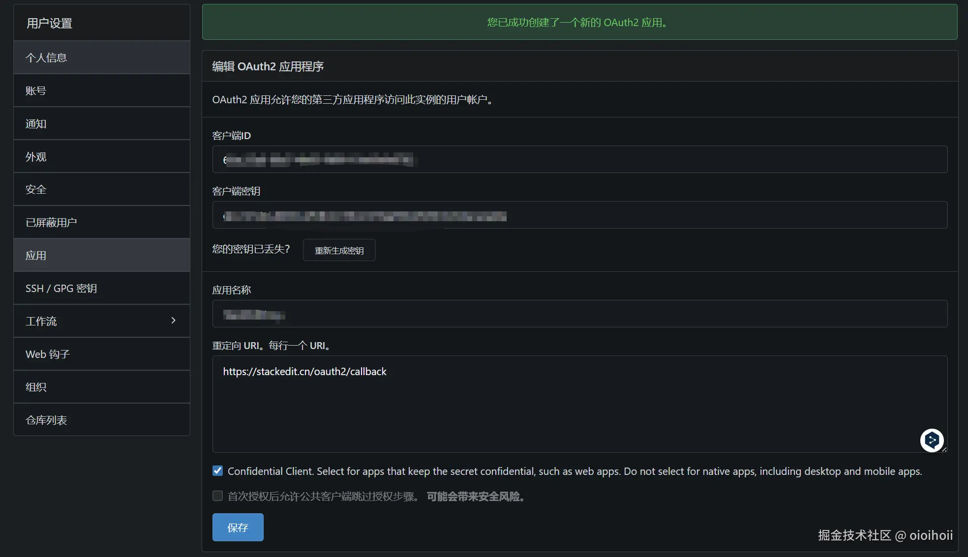 点击 Create 之后会看到 - Client ID → 对应 StackEdit 的 Application ID