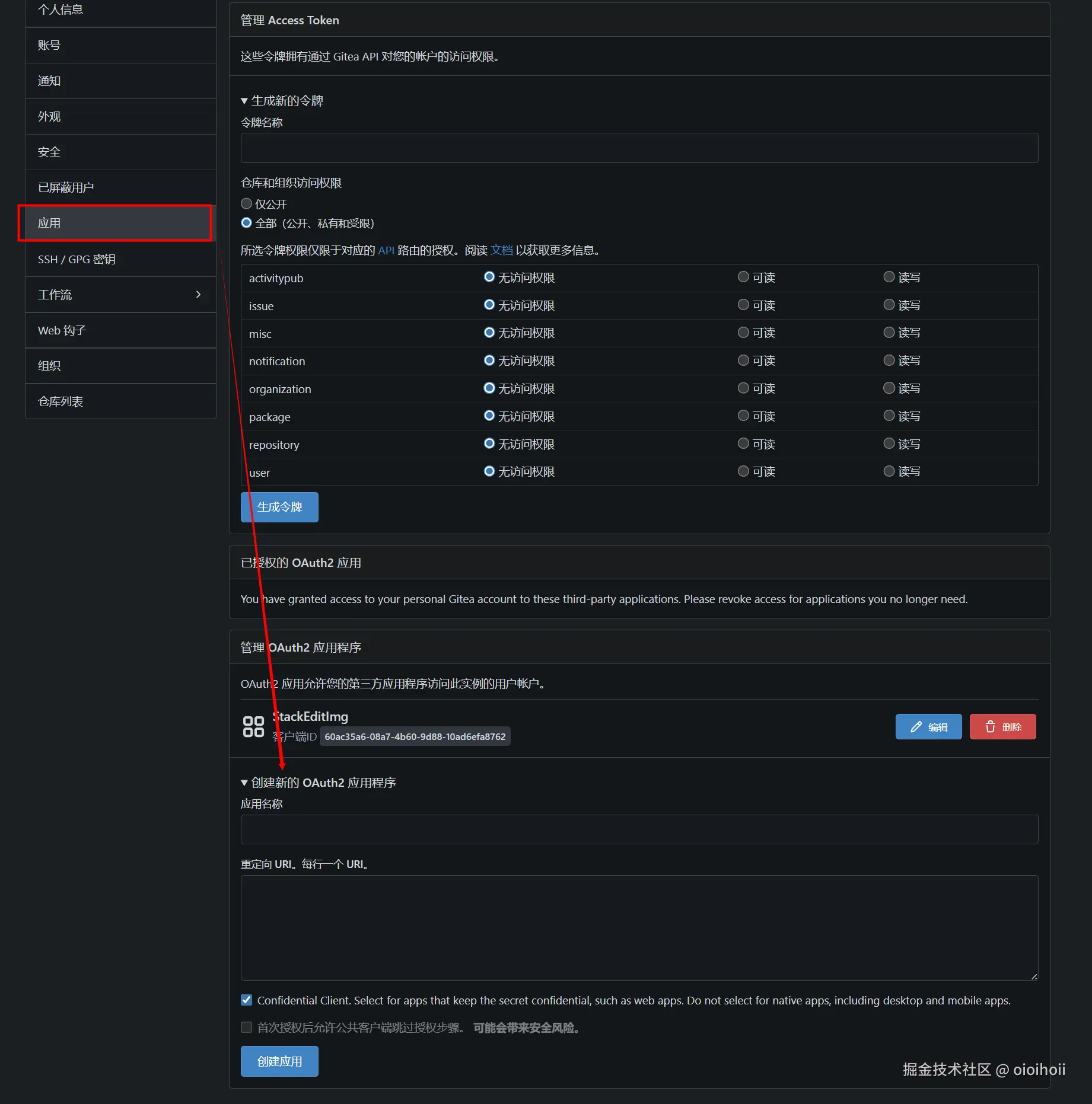 - 登录 Gitea → 右上角头像 → Settings → Applications → OAuth2 Applications → Create a new OAuth2 Application