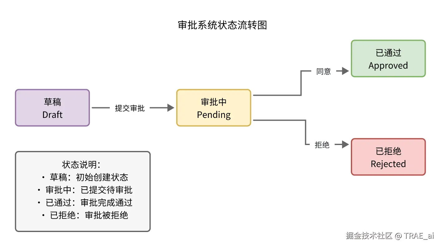 1. 审批单状态流转:Draft → Pending → Approved/Rejected