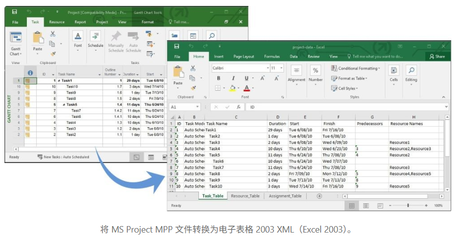 project.save("project-data.xml", tasks.saving.SaveFileFormat.SPREADSHEET2003)这将生成一个可以在 Excel 2003 或更高版本中直接打开的 XML 文件。