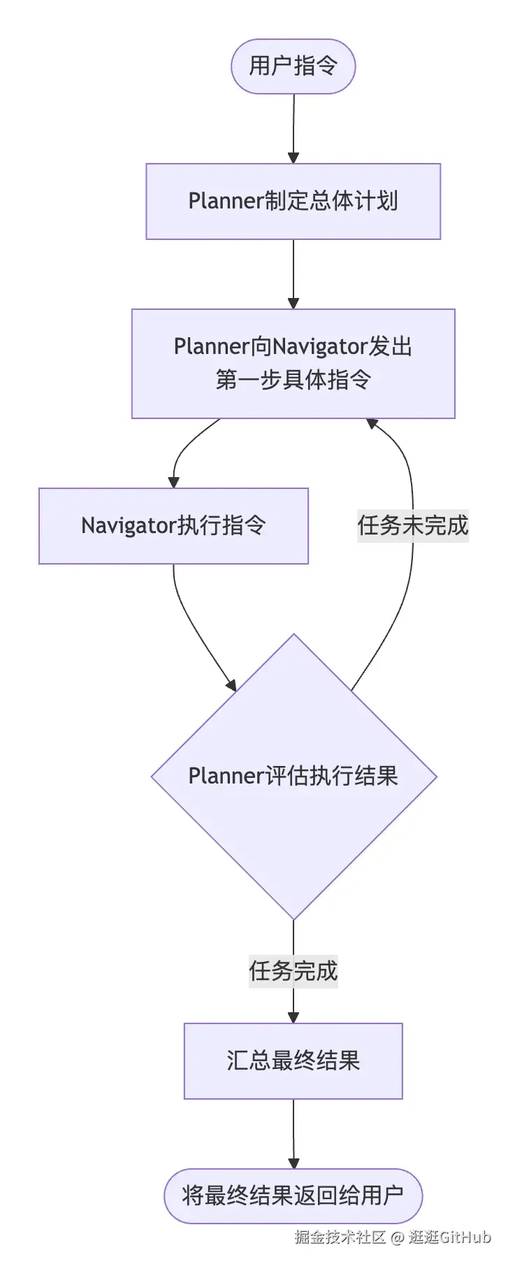 智能体间的协作流程 :用户指令-> Planner 制定计划-> Planner 向 Navigator 发出第一步指令-> Navigator 执行并返回结果/状态-> Planner 评估结果并发出下一步指令-> ... -> 任务完成,将最终结果汇总给用户