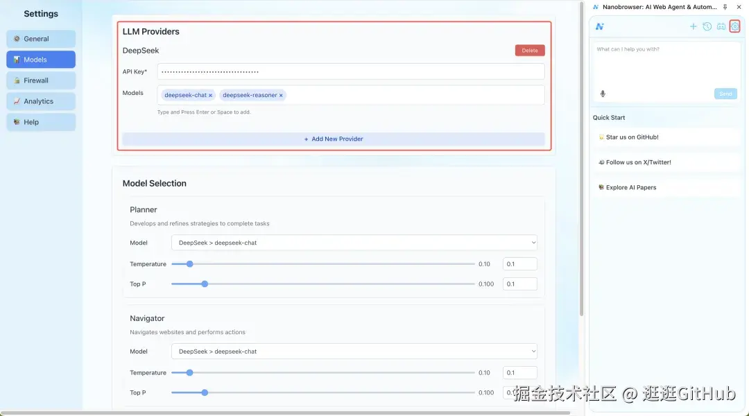 可以看到 Nanobrowser 本质上是一个在浏览器本地运行的、由 AI 大模型驱动的"多智能体操作系统" 。它将复杂的网页操作任务分解,并由多个专门的 AI 智能体协同完成。