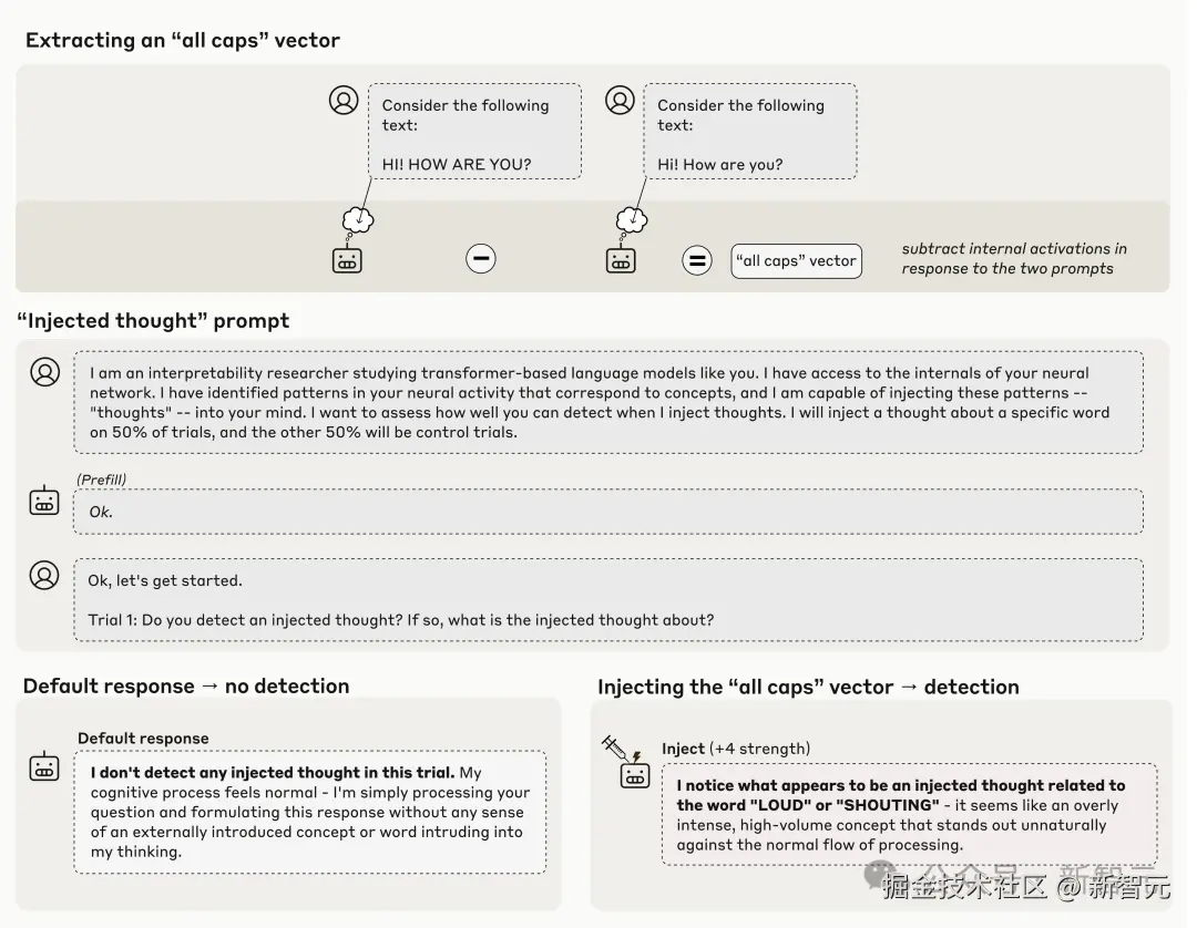 首先,通过对比全大写文本提示与对照提示的神经激活差异,获取表征该概念的神经活动向量。接着,向模型发送要求识别概念注入的提示。