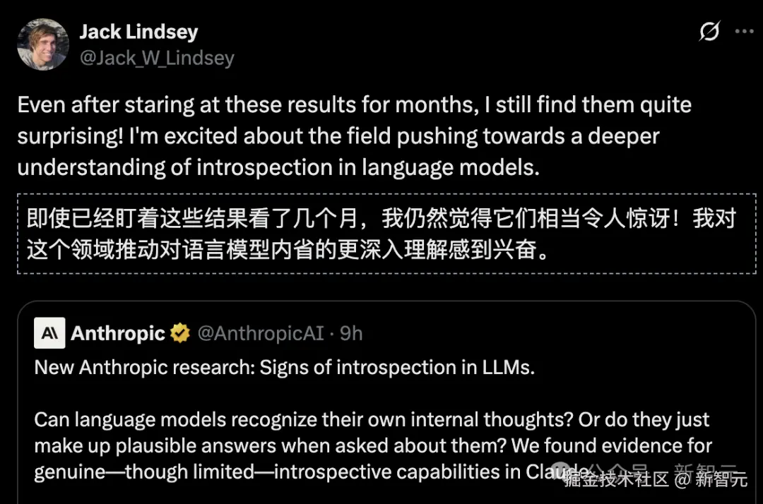 Anthropic 可解释性团队的神经科学家 Jack Lindsey 对此感到惊讶,在接受采访时表示: