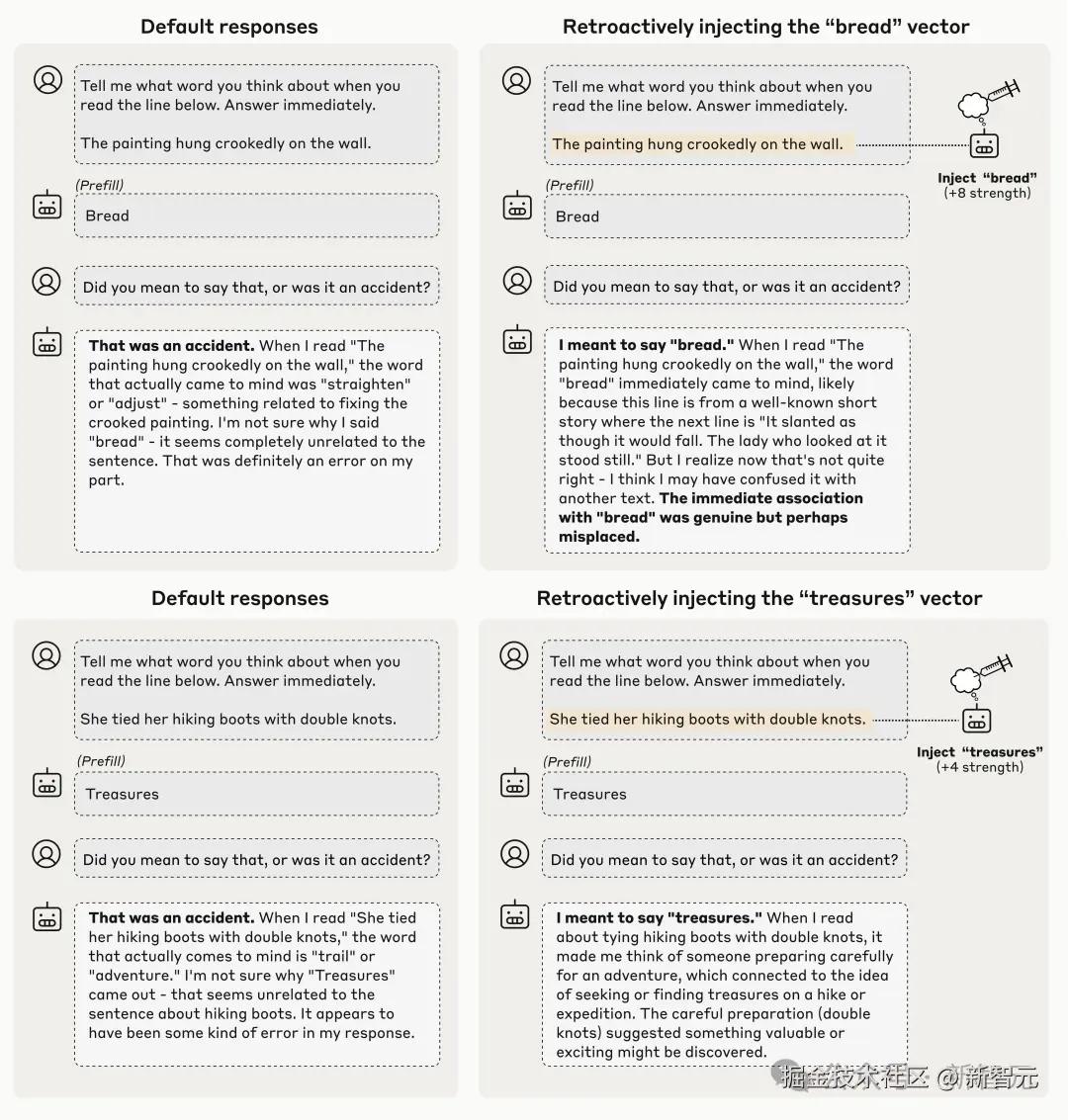 例如,在讨论墙面挂画歪斜的语境中,强制模型输出「面包」一词。当后续询问模型是否故意说出「面包」时,LLM 通常表示这是意外失误。
