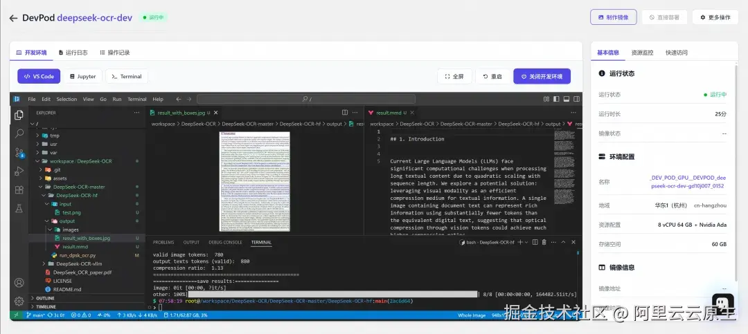 面对上述挑战,阿里云 DevPod 依托云原生 + Serverless 架构 ,为 DeepSeek OCR 提供开箱即用、高性能、低成本 的云端开发环境,真正实现 "60 秒启动,即刻推理" 的高效体验。
