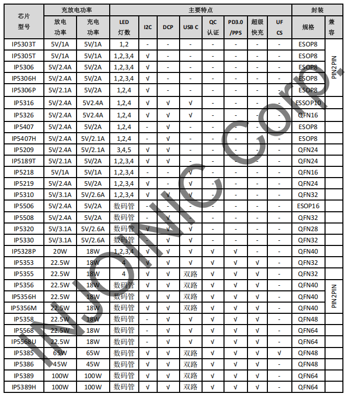 IP5326 是一款在集成度、协议兼容性和智能化程度上表现突出的移动电源SOC 。其Type-C DRP协议支持、高效率充放电和丰富的PIN选配置 ,使其成为高端紧凑型移动电源的理想选择。无论是追求接口现代化、功能多样化还是品牌定制化 ,IP5326都能提供高度灵活和可靠的解决方案。