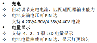 - 支持4颗、2颗或1颗LED电量显示,电量曲线可通过PIN选电阻调整,显示更均匀直观。