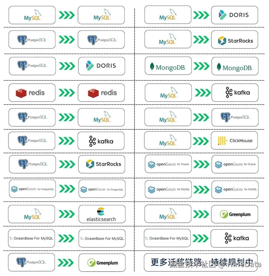 数据复制与对比支持 60 种主流数据库之间的数据迁移、实时同步、数据对比,可以完全替代 Canal、FlinkCDC、DataX、DTS 等产品,用于数据库信创迁移、ETL、容灾、跨云数据同步等场景。