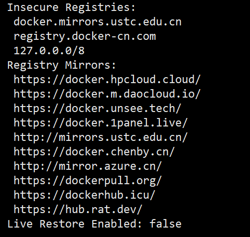 sudo systemctl restart docker换源后我们查看docker信息,验证是否成功换源