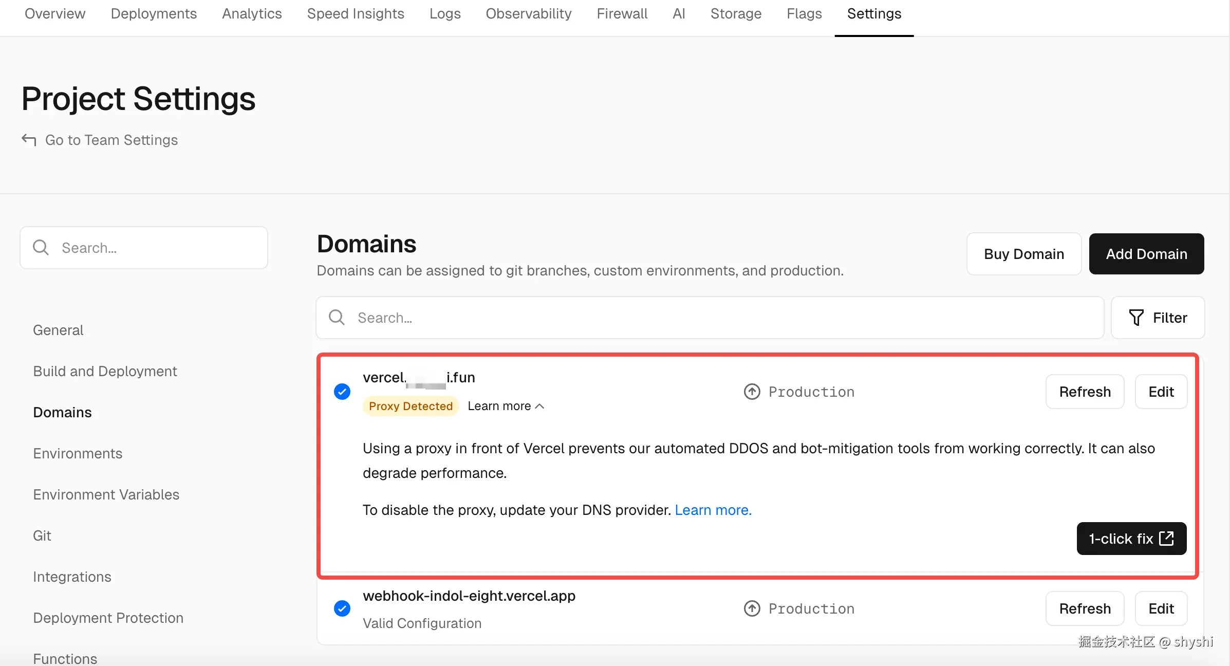 回到 vercel 项目 settings--> Domains中查看域名解析生效后即可通过xxx.xxx.com访问服务。
