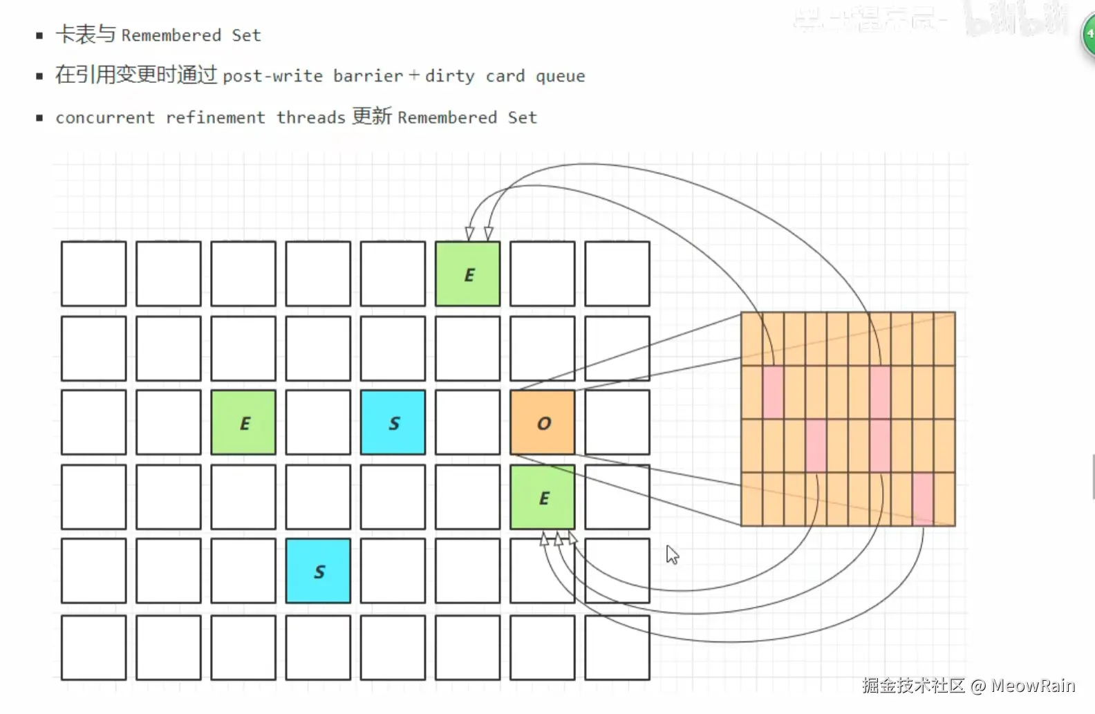 记忆集是一种抽象概念,用于在实现部分垃圾收集(Partial GC)时用于记录从非收集区域指向收集区域的指针集合,卡表是记忆集的一种实现方式。例如在分代式GC中,通常能单独收集的只有Yong gen,那记忆集记录的就是Old gen指向Young gen的跨代指针。