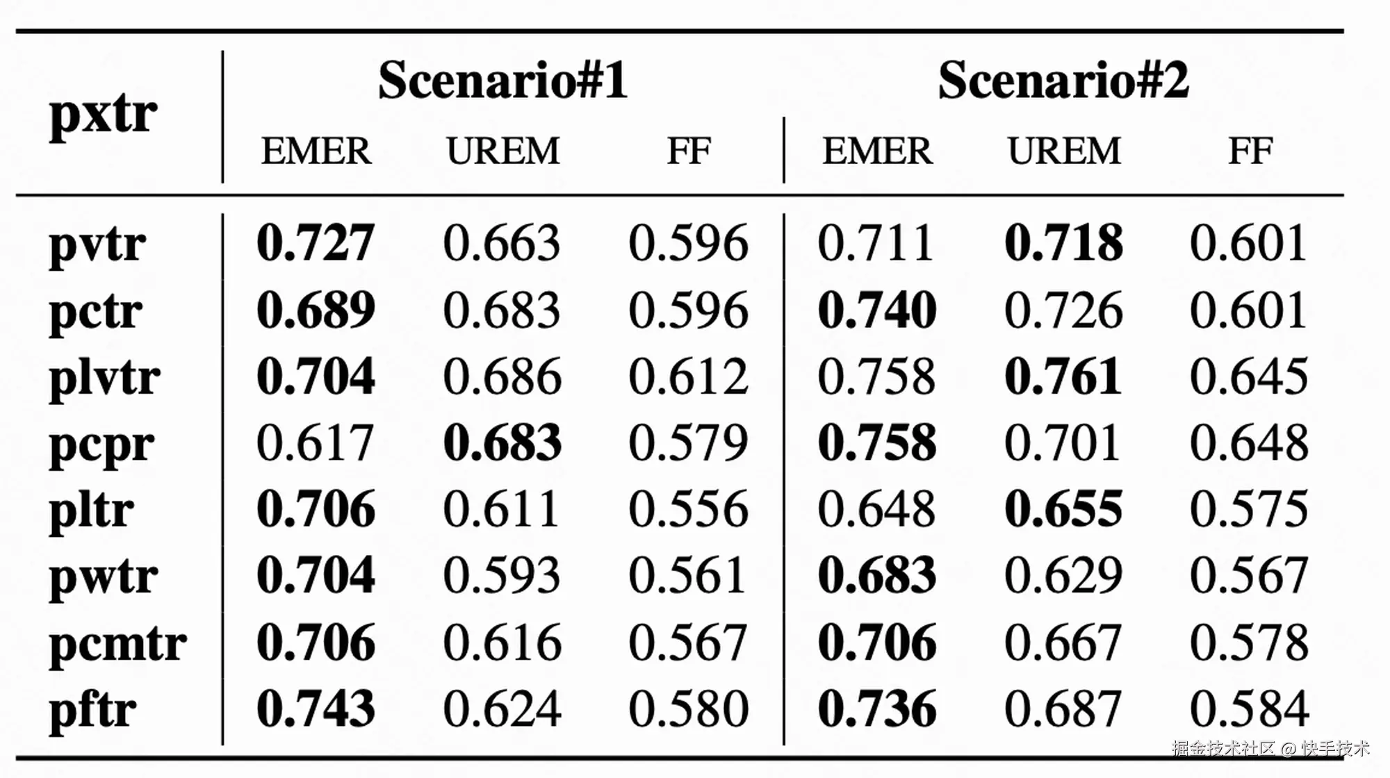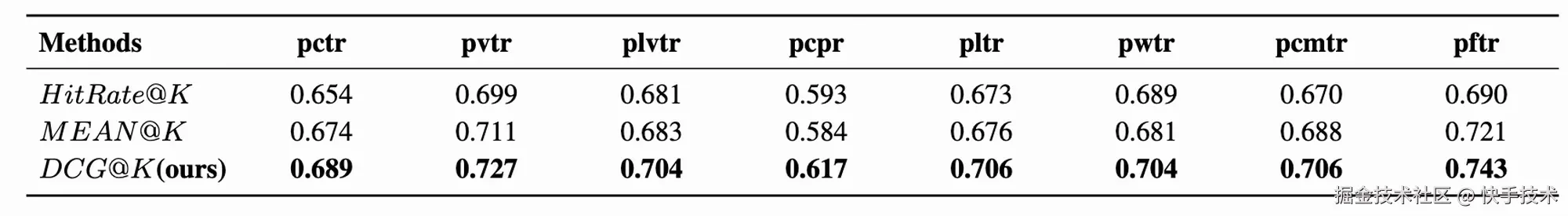 为了评估最终的排序结果和主要 PXTR 信号之间的一致性,我们计算了不同的排序融合方式得到的最终排序和不同 pxtr(主要包括观看时长 pvtr,有效播/长播/完播 pctr/plvtr/pcpr,点赞/关注/评论/转发 pltr/pwtr/pcmtr/pftr)之间的 GAUC。数据如下表(表中 UREM 为业界最新的使用模型融合的尝试)所示,EMER 方法得到的排序在大部分 pxtr 上均取得了最好的一致性。