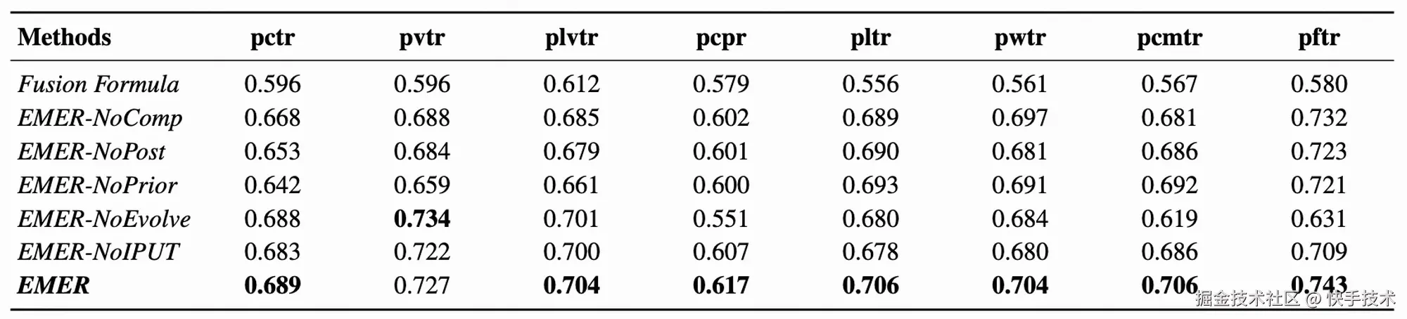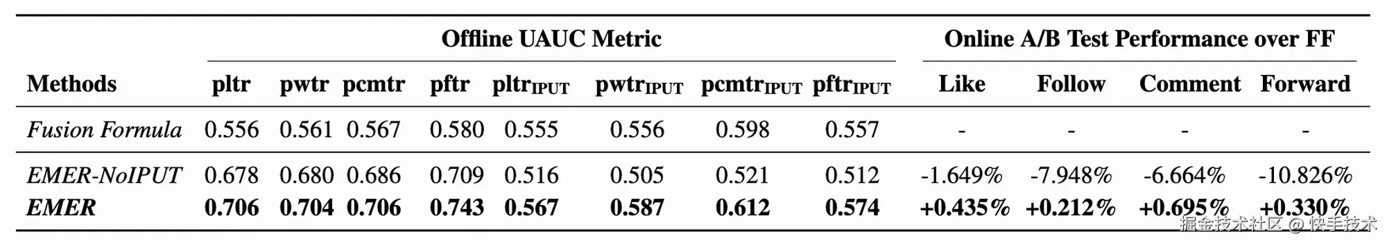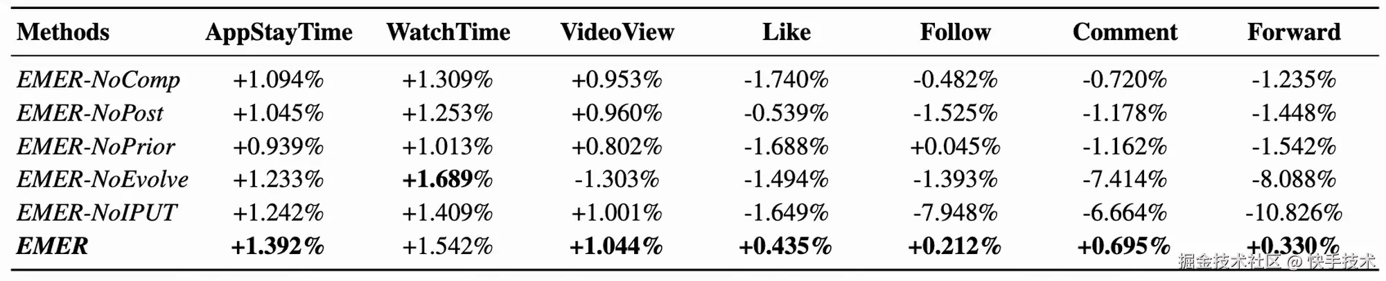 为了验证 EMER 模型里,到底是哪些设计在 "真正发力",快手策略算法团队做了一组 "消融实验"。实验结果表明,模型中各个设计均对最终性能具有显著影响。