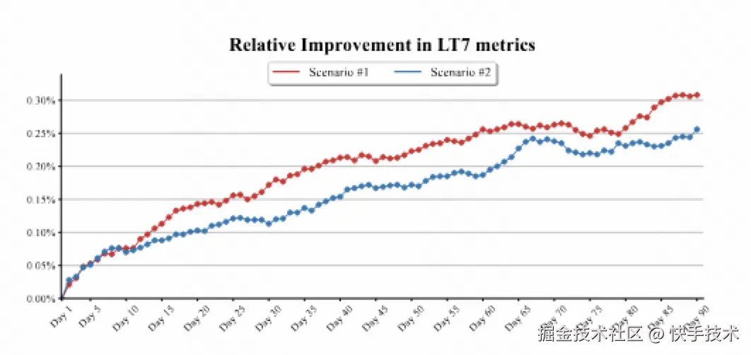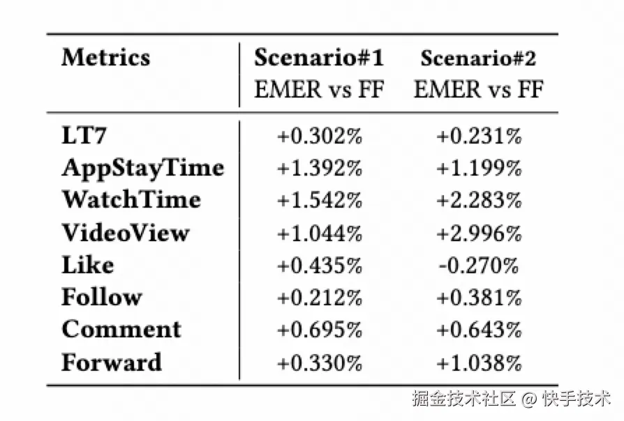 下面的表格是 AB 实验的双重差分结果。可以看到,EMER 相较于融合公式的方法,在推荐系统的核心指标如 LT、时长、vv 和互动等指标上都取得了显著的提升!而目前的 LT 折线图结果则表明,LT 仍然有不断上升的趋势。