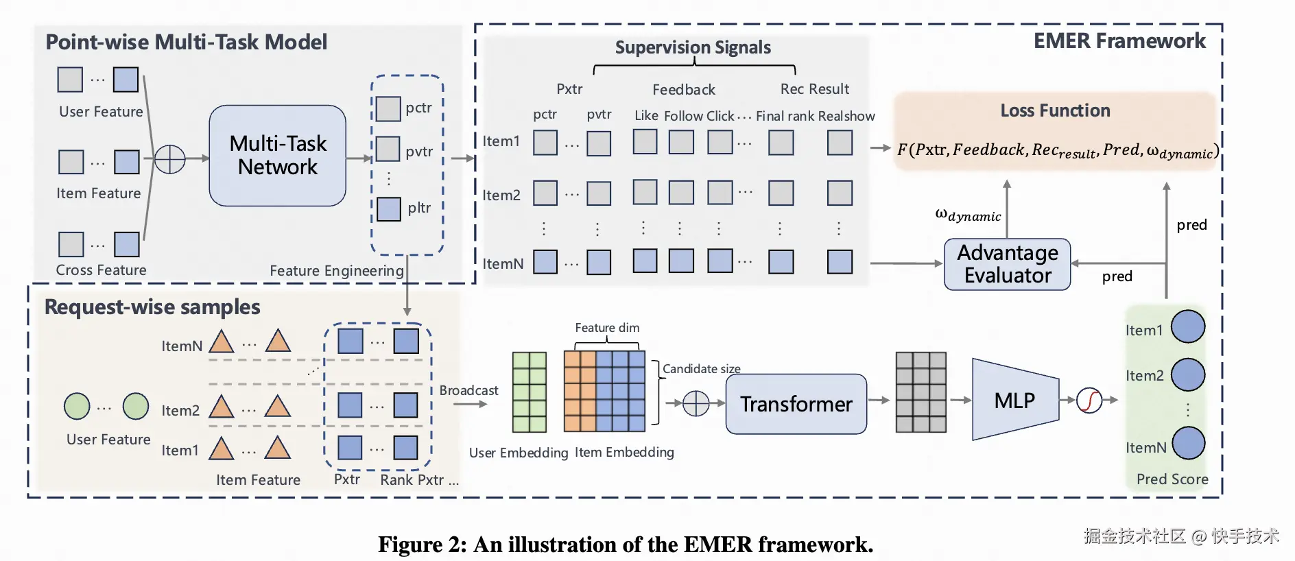 样本组织: 传统方法只看用户互动过的少数几个 item。但我们知道,用户的一次请求中,其实有大量候选 item。EMER 是把一次请求的所有候选 item(无论是否曝光)都打包成一个样本。这不仅能解决曝光偏差问题,还直接为模型提供了丰富的比较对象,并且与在线对所有候选的比较排序过程更加一致。