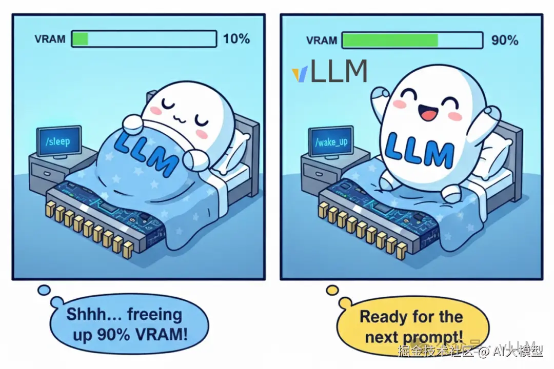 vLLM睡眠模式提供了第三种方案: 模型在几秒内进入休眠,快速唤醒------在保持按需加载效率的同时,实现持久化服务的速度。