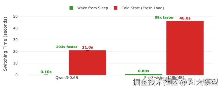 - • 模型切换: 唤醒时间极快(约0.1-0.8秒),实现了58-203倍的加速相比冷启动