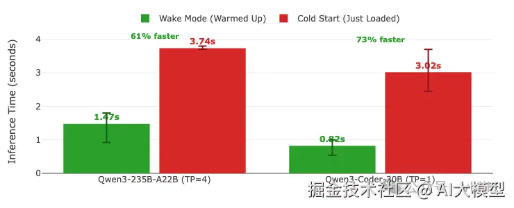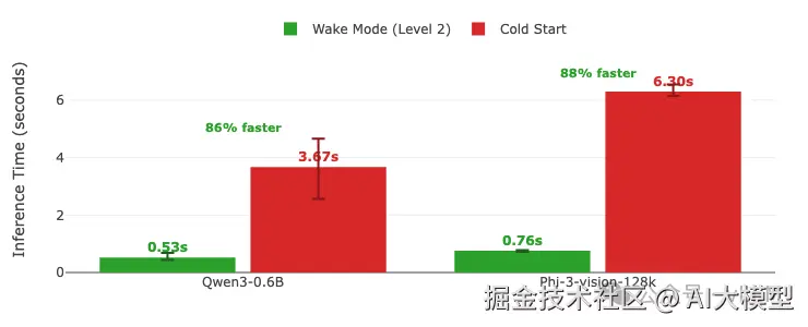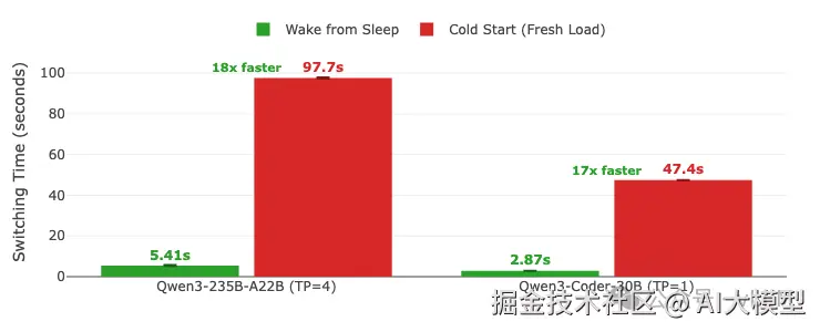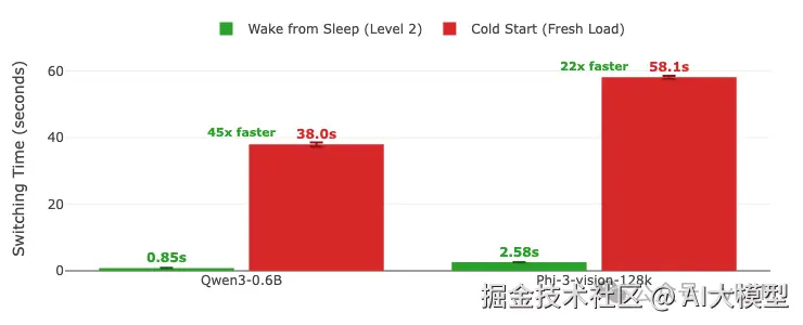睡眠模式最显著的优势体现在模型切换时间上。唤醒休眠模型比加载全新的vLLM实例快18-20倍。