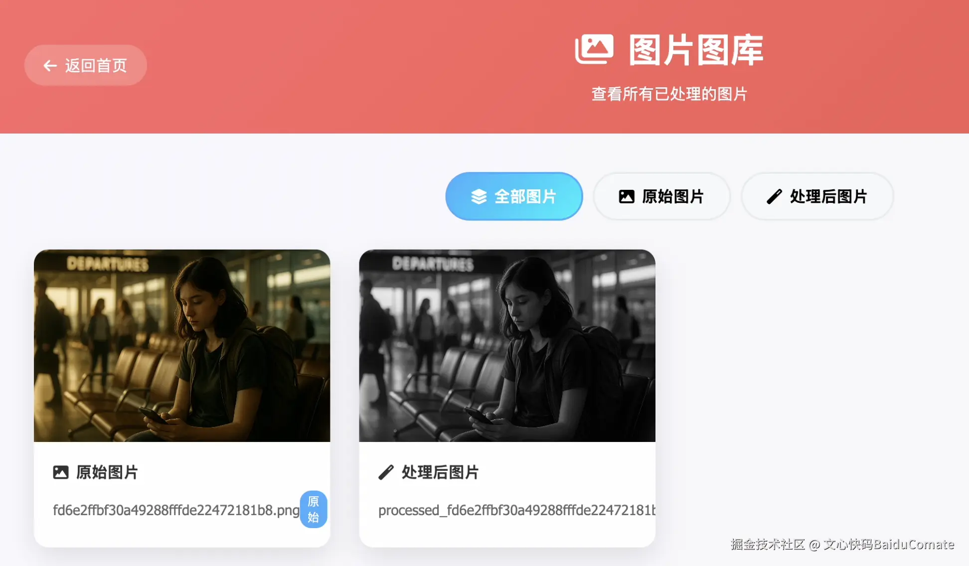 你是一个前端页面的图像处理专家,当前项目首页是用户上传图片,然后后端处理好图片后,呈现在首页,供用户对比使用。首页有一个图库按钮,点击后可跳转到图库页面,用户可以查看自己上传过和处理后的图片,希望图库页面展示可以滑滚加载。