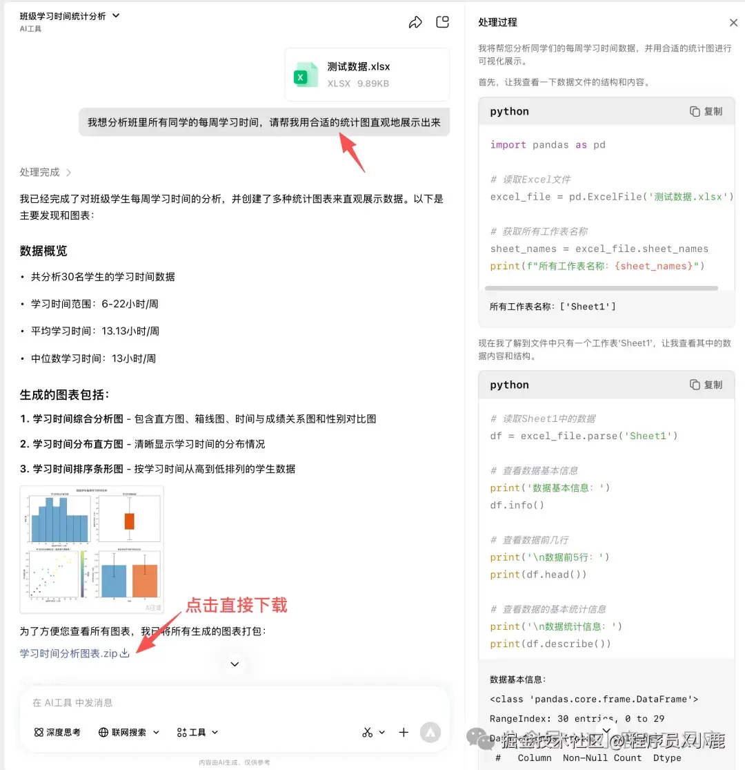而同样的问题,升级后的元宝,直接自己编写、执行代码生成合适的统计图,并最终将所有统计图打包发给了我们。