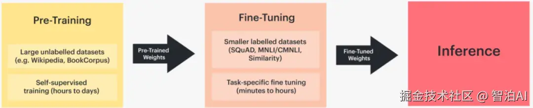 预训练阶段赋予模型通用的语言理解能力,微调过程则针对具体任务实现针对性优化与适配。