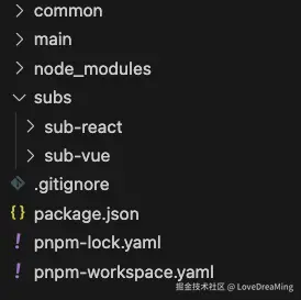 - 使用的是monorepo架构,目录结构如下,具体可参考我的wujie工程源码,其中common 是公共库(供主应用和子应用通用的代码和资源),main 是主应用工程,subs/sub-react 是react框架的子应用工程,subs/sub-vue 是vue框架的子应用工程