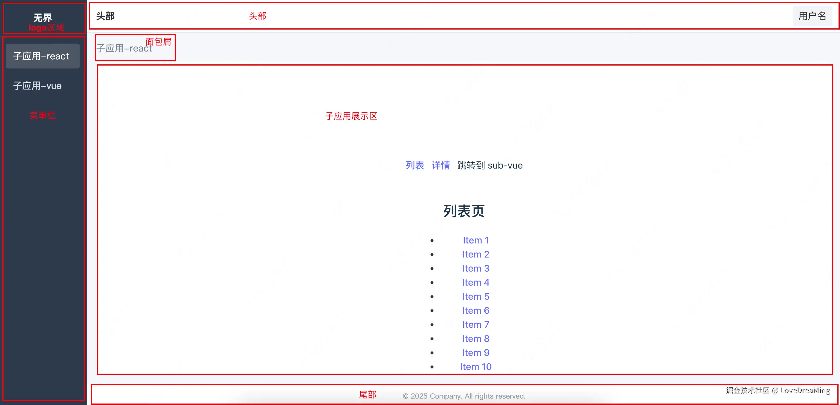 - 页面内容如下图,采用常用的后台管理系统布局方式,分为logo区域、菜单栏、头部、面包屑、子应用展示区、尾部等几个部分,其中子应用展示区用来展示切换左侧菜单栏或者路由变化时的不同子应用