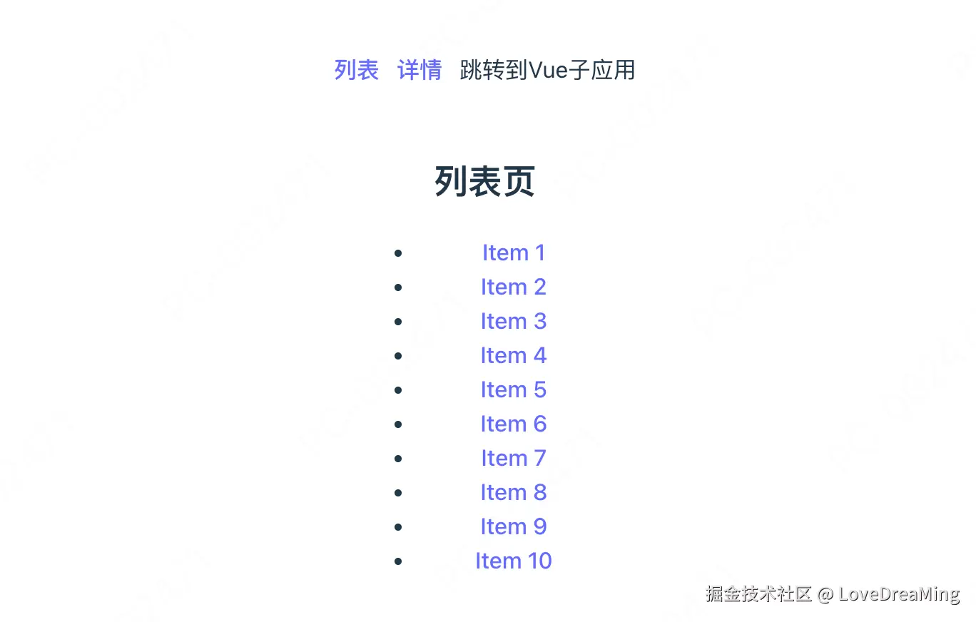 - 页面内容如下图,首页及列表页,分为列表页和详情页为了实现react子应用内部的路由跳转,跳转到Vue子应用 按钮是为了直接从react子应用跳转到vue子应用