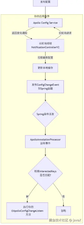 监听并处理事件( @ApolloConfigChangeListener的工作) :- @ApolloConfigChangeListener是一个注解,它的背后有一个 Spring AOP(面向切面编程)的处理器,例如- ApolloAnnotationProcessor。