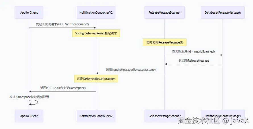 - 如果有该客户端关心的配置发布,NotificationControllerV2 会调用 DeferredResult 的 setResult 方法,传入有配置变化的 namespace 信息,同时该请求会立即返回。客户端从返回的结果中获取到配置变化的 namespace 后,会立即请求 Config Service 获取该 namespace 的最新配置。