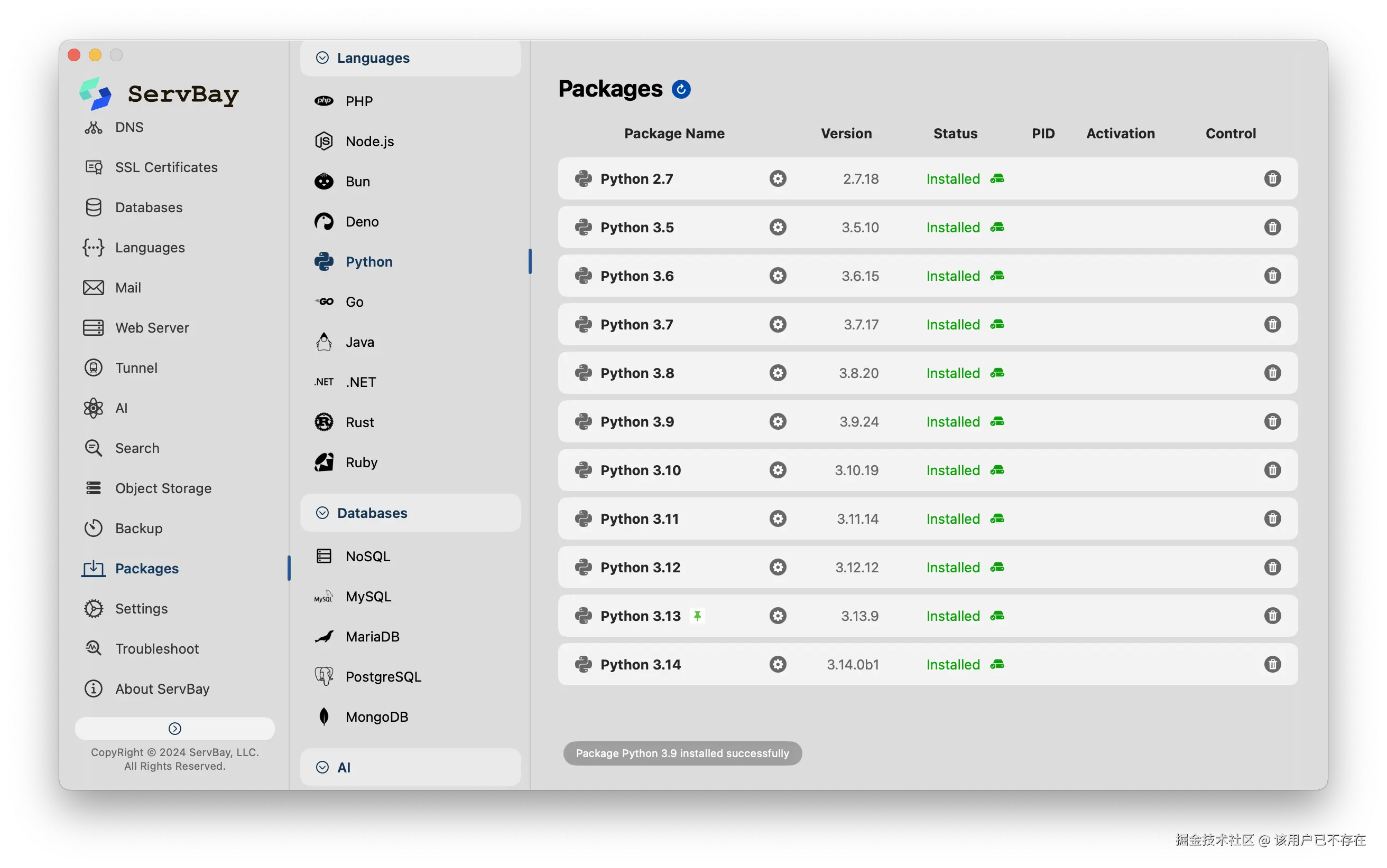 那就不得不安利ServBay了,它能一键安装和管理N个Python版本,支持从老掉牙的2.7到最新的3.14。不管是维护祖传代码,还是开发新项目,都不用再为Python版本兼容性问题挠头了。环境搞定了,咱们才能安心搞开发。