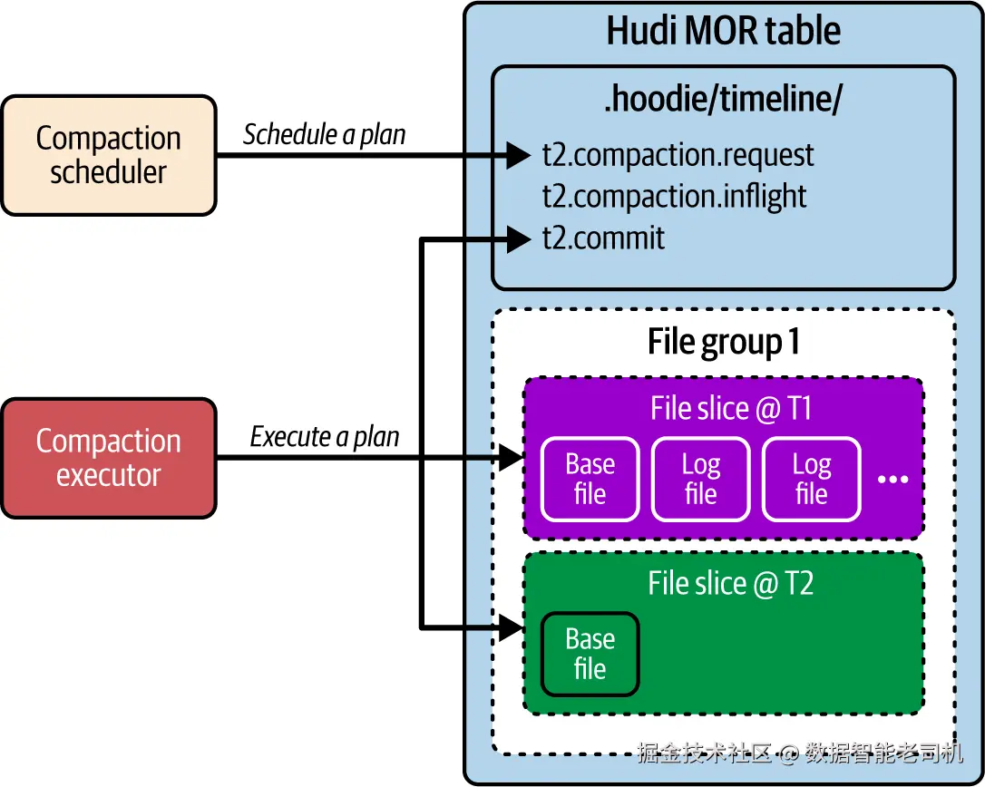 (图 6-5 Hudi MOR 表中的压缩流程:压缩调度器与执行器如何管理文件切片并更新时间线)
