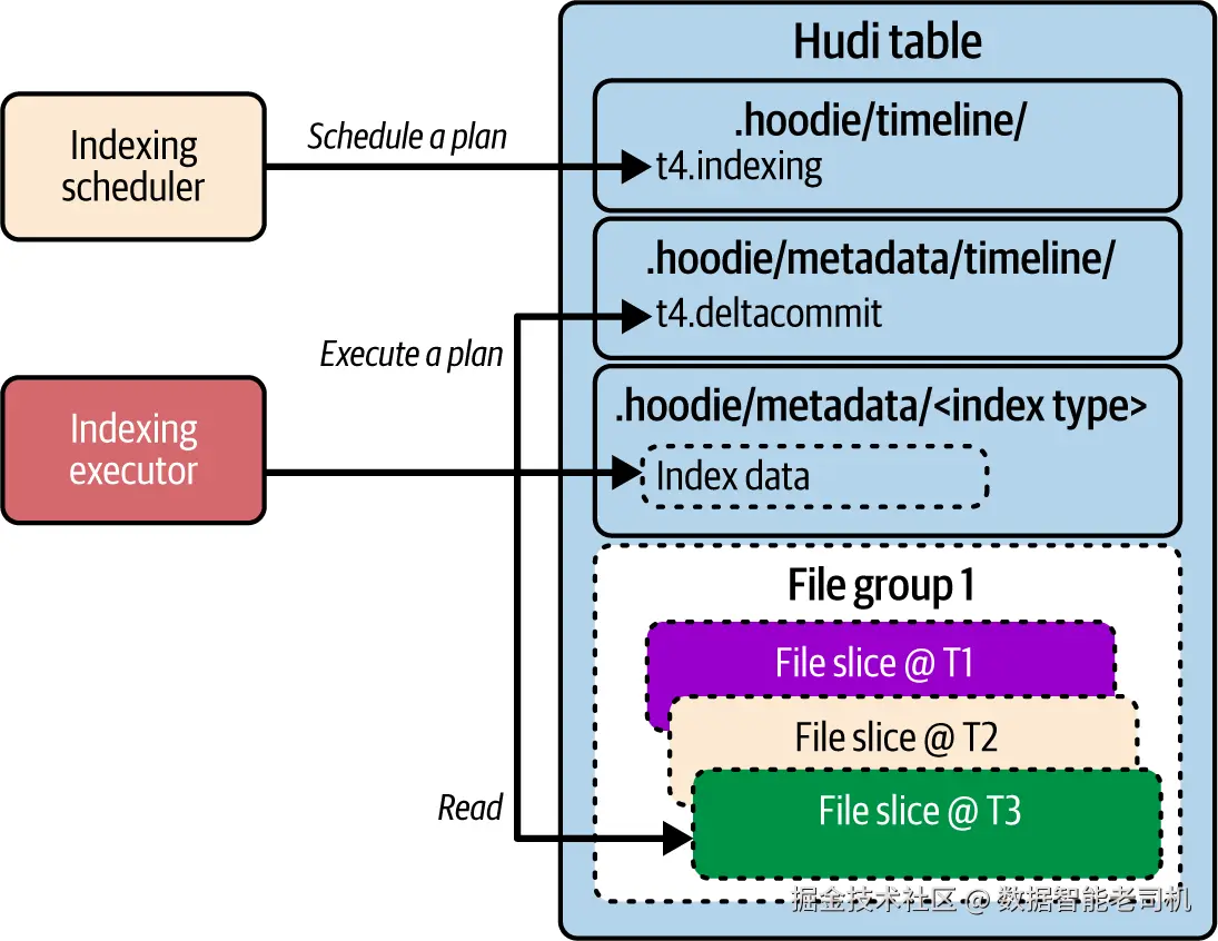 但对于 record index 与 secondary index 这类索引,元数据表中的索引项会随表的记录数 线性增长。因而在大型存量表 上启用这些索引,意味着需要扫描大量文件切片来从零构建索引 ------这既耗时 ,又不允许在索引构建期间中断 写入或查询;相反,读写应在此期间照常运行 ,至多出现性能降级 。此外,索引构建完成时,还必须保证索引与最新写入的数据一致。这些挑战正是**索引表服务(Indexing Table Service)**存在的动机。