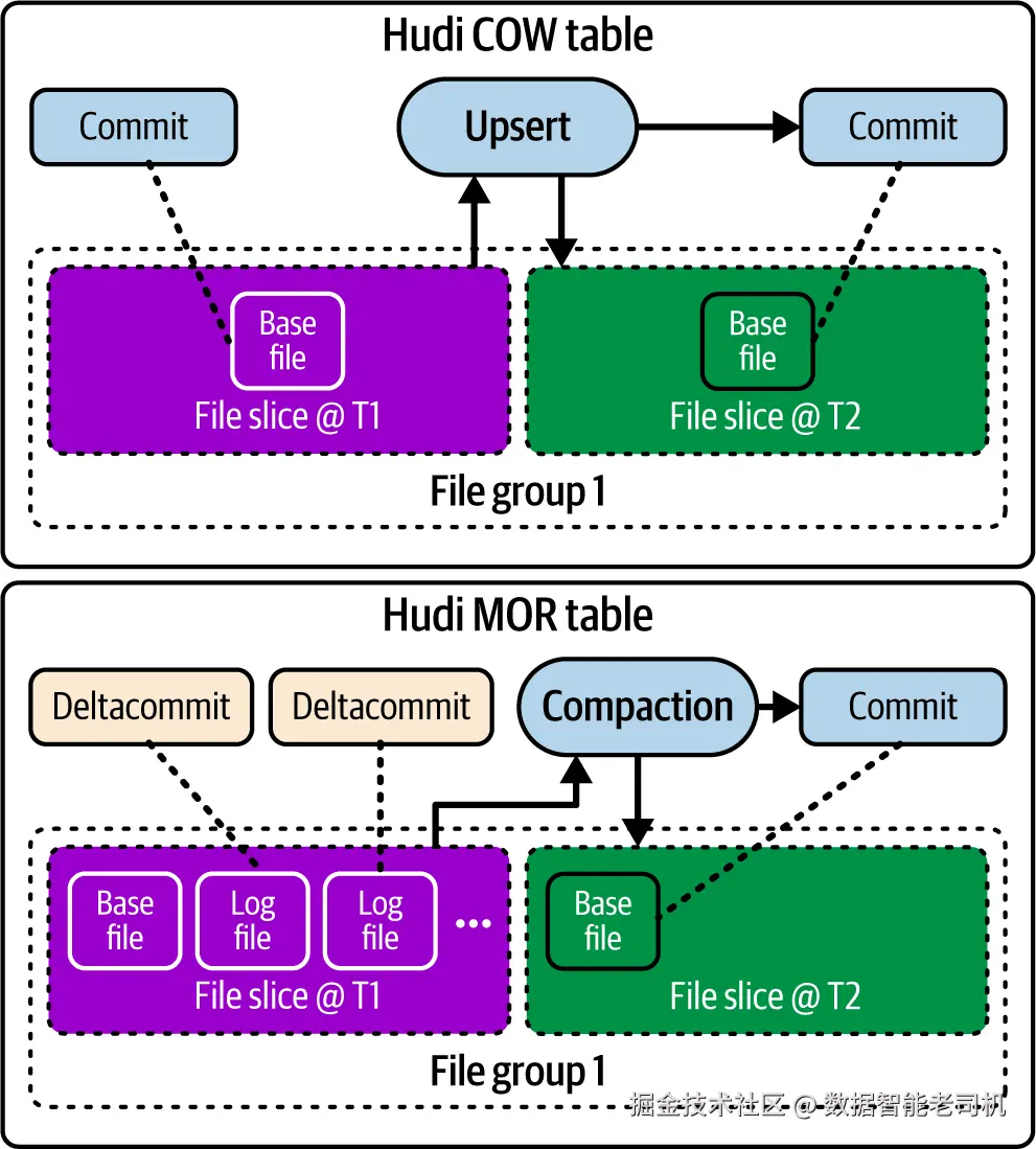 把 MOR 的压缩与 COW(Copy-on-Write,写时复制)表的写入过程对比,会更清楚两者的本质差异(见图 6-6)。在 COW 表中,任何更新或删除都会触发一次 commit ,重写整个文件切片;而在 MOR 表中,这些变更会被高效地追加 到日志文件中,并由压缩 定期运行,将日志与基文件合并、优化该文件切片以便读取,并产出一次 commit 动作。从本质上说,COW 表等于每次写入都在做隐式的压缩 ;这在功能上相当于:MOR 表在每次 deltacommit 之后都配置为内联压缩。