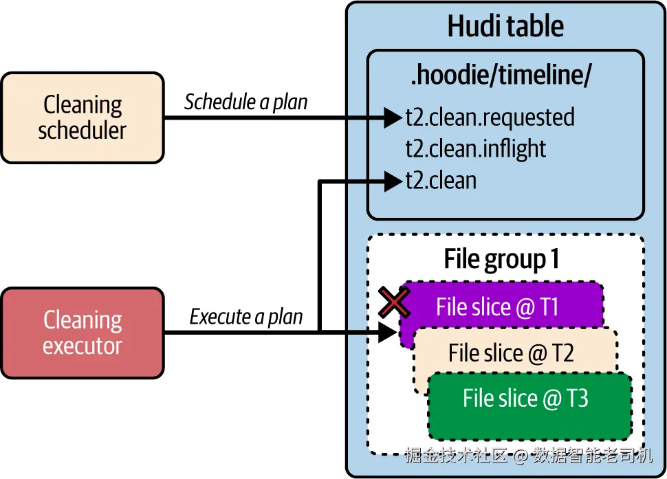 Hudi 通过 MVCC (多版本并发控制)在写入者与读取者之间实现快照隔离 ,即维护数据文件的多个版本。多版本文件使得时间旅行、增量查询等强大能力成为可能,但随着时间推移也会显著抬高存储成本。随着新数据不断到来,Hudi 表会持续创建文件切片来表示更新的版本 ,从而不可避免地占用更多存储空间。清理服务(Cleaning)正是为此而生:它会删除更早的、无需保留的文件版本,以控制存储成本(见图 6-9)。