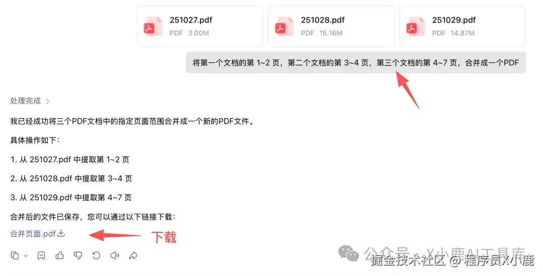 除此之外,腾讯元宝还可以将多个 PDF 文件的指定页合并成一个 PDF。