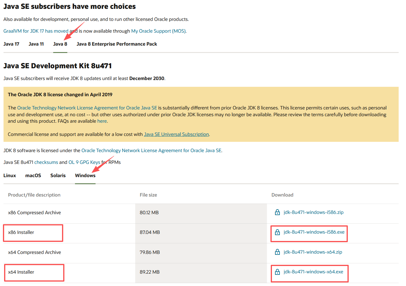 访问官网下载页,滚动页面找到如下,选择Java8,根据自身Windows系统选择x64或x86位。