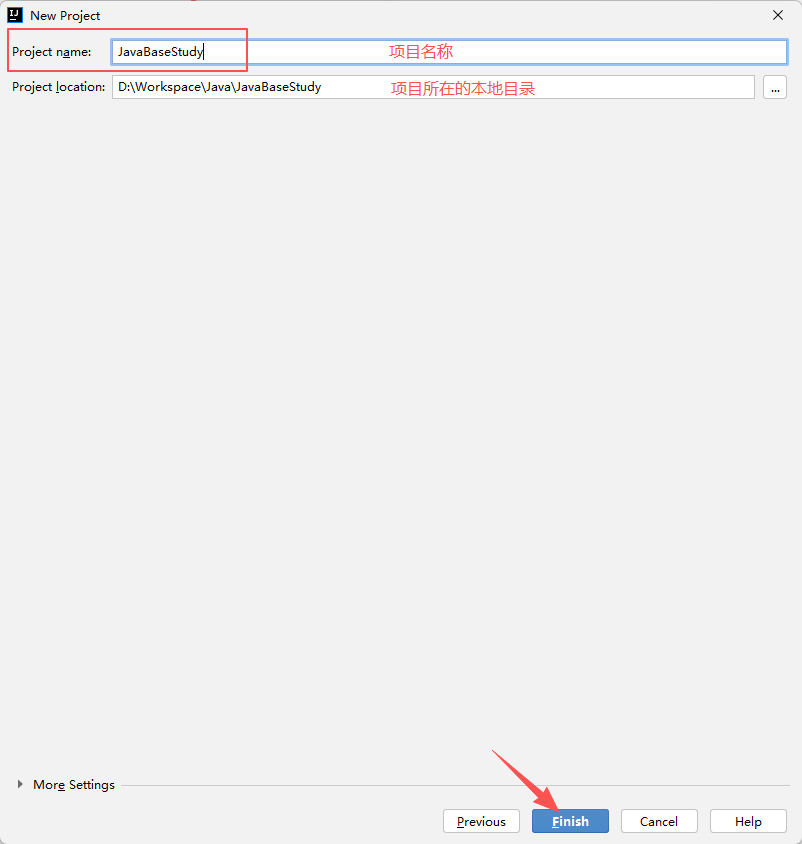 修改Project name项目名为JavaBaseStudy,项目路径建议放其他盘(不建议放C盘),然后点Finish完成。