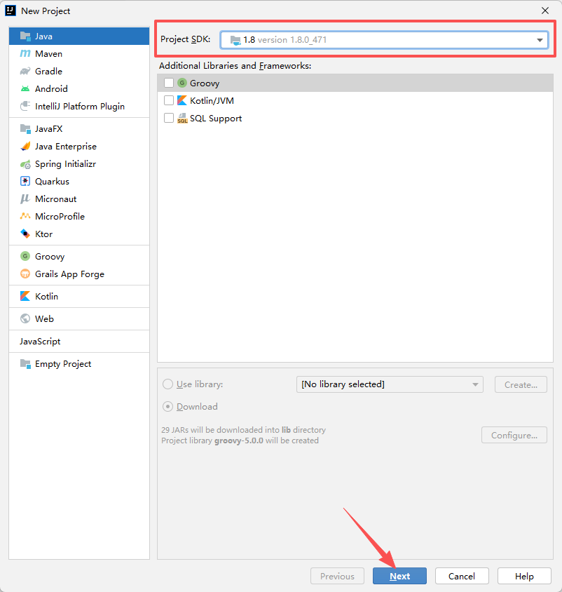 项目的开发工具包,我们选择上面安装的Java8开发环境(JDK),然后点击下一步。