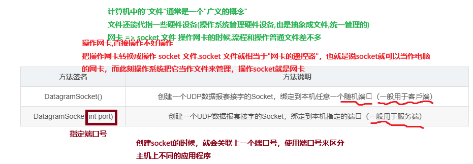 | DatagramSocket(int port) | 创建⼀个UDP数据报套接字的Socket,绑定到本机指定的端⼝(⼀般⽤于服务端) |
