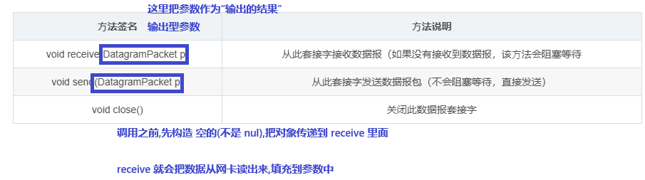 | void receive(DatagramPacket p) | 从此套接字接收数据报(如果没有接收到数据报,该⽅法会阻塞等待 |