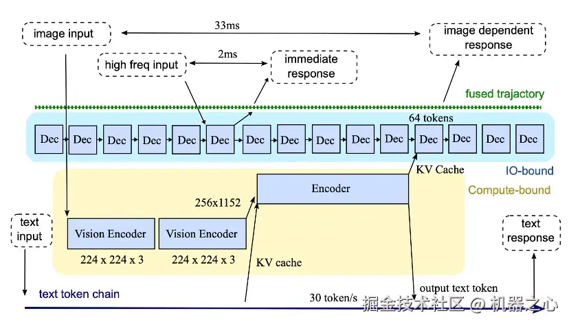 视觉反应(30Hz):处理来自摄像头的画面。就像你看着球飞过来,用眼睛跟踪并判断落点。这部分由模型的 "编码器" 负责。