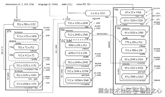 Pi0 模型计算流程图示,它主要包括 1 个视觉编码器,1 个编码器和 1 个解码器;所有这些又可进一步分解为一系列的矩阵乘法和标量运算。