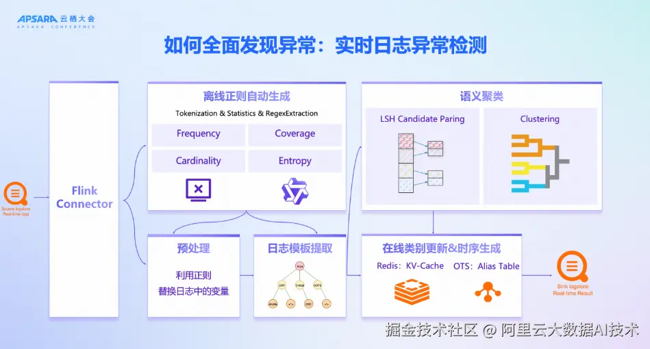 除了结构化指标外,日志作为另一类重要可观测数据,也纳入了检测体系。由于日志体量庞大、格式杂乱,以往主要依靠关键词过滤的方式进行监控,不仅维护成本高,而且只能发现已知问题。为了突破这一局限,"智能哨兵"构建了一套基于Flink的实时日志聚类系统。该系统包含两个核心模块:首先是结构化解析,通过定期抽样历史日志,统计分词频率,自动识别高频变量并生成解析规则,再利用轻量级日志解析算法对日志文本进行结构拆解,形成标准化的日志模板;其次是语义化聚类,将生成的模板进行向量化处理,并结合实时层次聚类算法与局部敏感哈希策略提升比对效率,使得语义相近但文本不同的日志也能被归为一类。