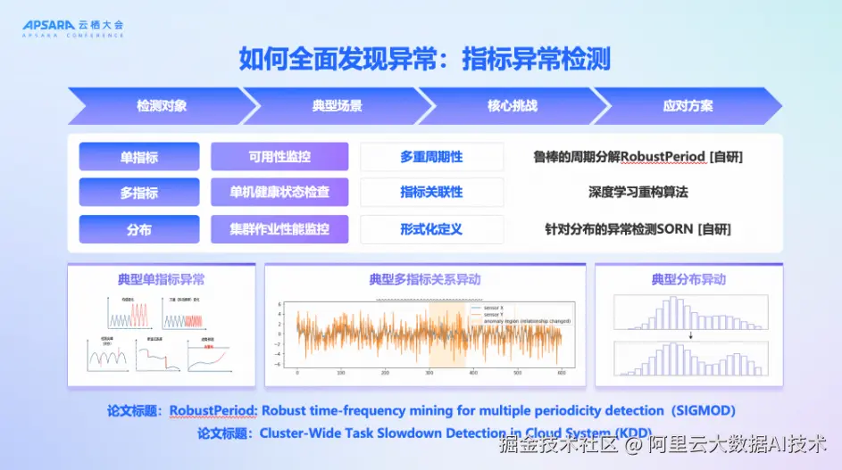 此外,针对平台上每日运行的数百万乃至上千万个作业,传统逐个监控的方式成本高昂且易受个别作业扰动影响。"智能哨兵"转而采用全局视角,将所有作业的运行时长、资源消耗等关键参数描绘成一幅动态画像。在系统正常运行时,这幅画像保持相对稳定;一旦批量作业出现性能劣化,整体分布形态会发生扭曲。团队自研的异常检测算法能够准确识别此类分布变化,从而更早感知系统级风险。该项技术的相关研究《Cluster-Wide Task Slowdown Detection in Cloud System》已被KDD录用。