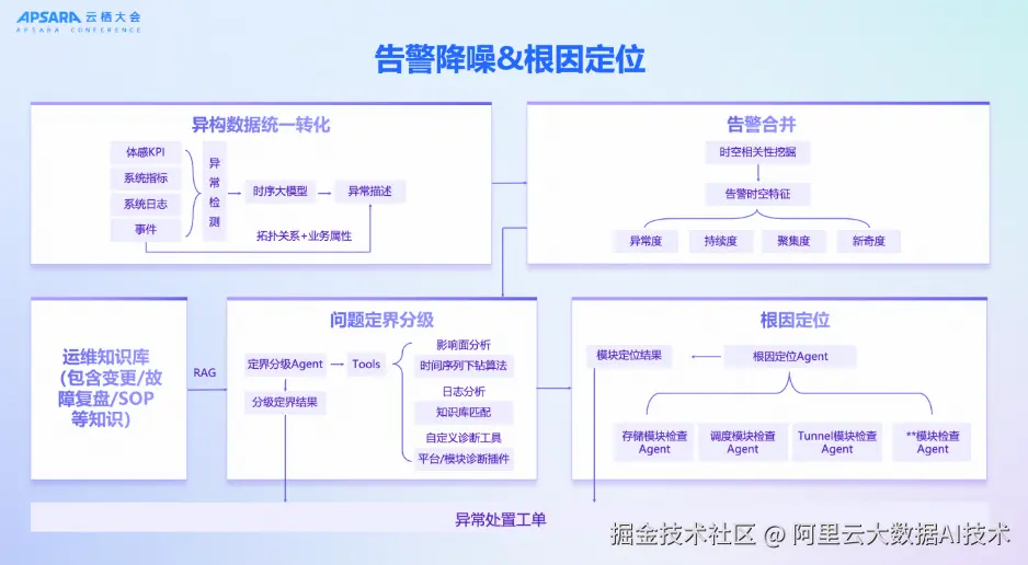 在2025云栖大会的ODPS分论坛上,阿里云智能集团算法专家张颖莹带来了题为《智能哨兵:AI驱动的云平台风险巡检》的主题分享,系统性地介绍了阿里云计算平台在智能化运维领域的最新实践,,一个集异常检测、告警降噪、根因定位于一体的端到端智能运维中枢。