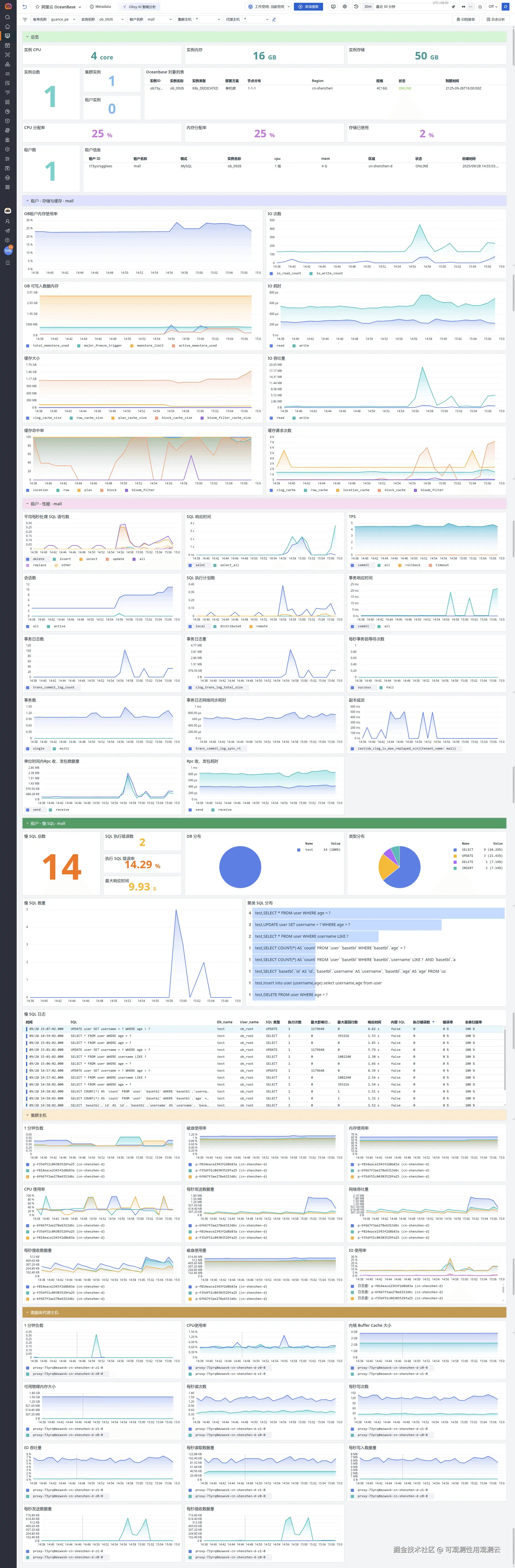 观测云集成阿里云 OceanBase,实时采集性能、租户、资源等指标与慢查询日志,提供统一可视化监控与告警,助力高效运维。