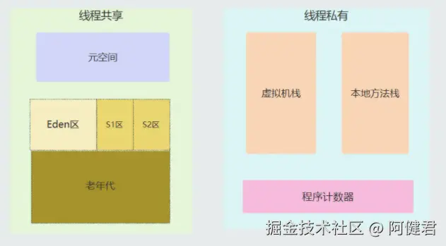 - 本地方法栈:专门为本地方法(由非 Java 语言编写,如 C/C++)的执行提供内存支持,线程私有,同样可能抛出StackOverflowError(栈深度超限)或OutOfMemoryError(内存不足)。